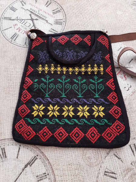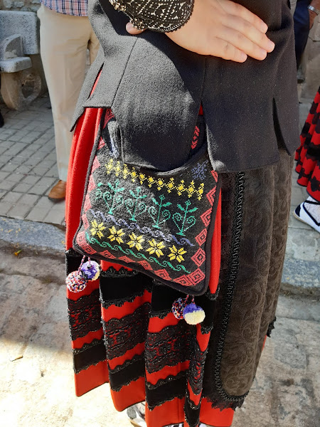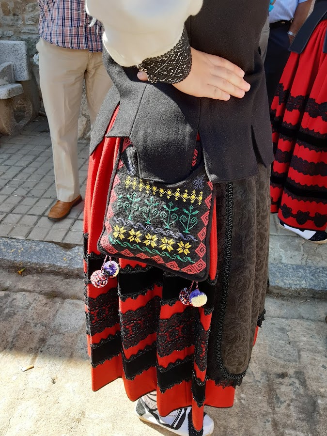 Por aquí os dejo una pieza de la indumentaria del traje regional de Arcones (Segovia). Es un bolso bordado a mano donde las mujeres guardaban el dinero, llaves, pañuelos,..
