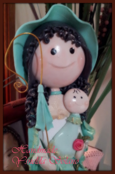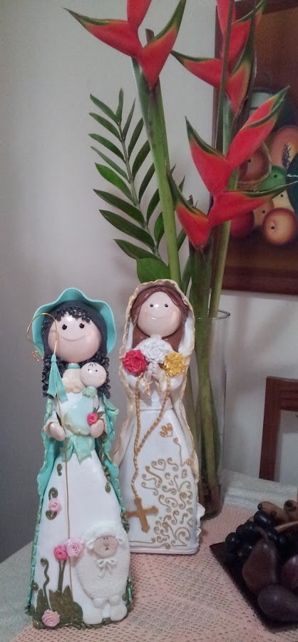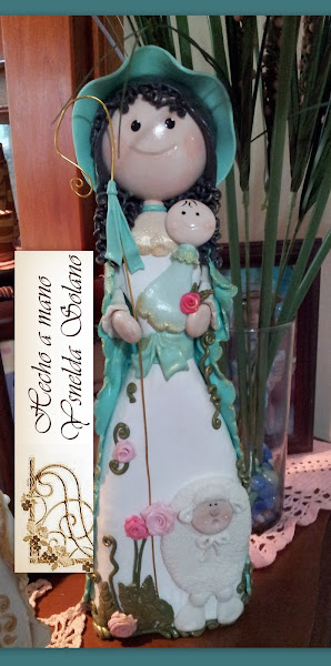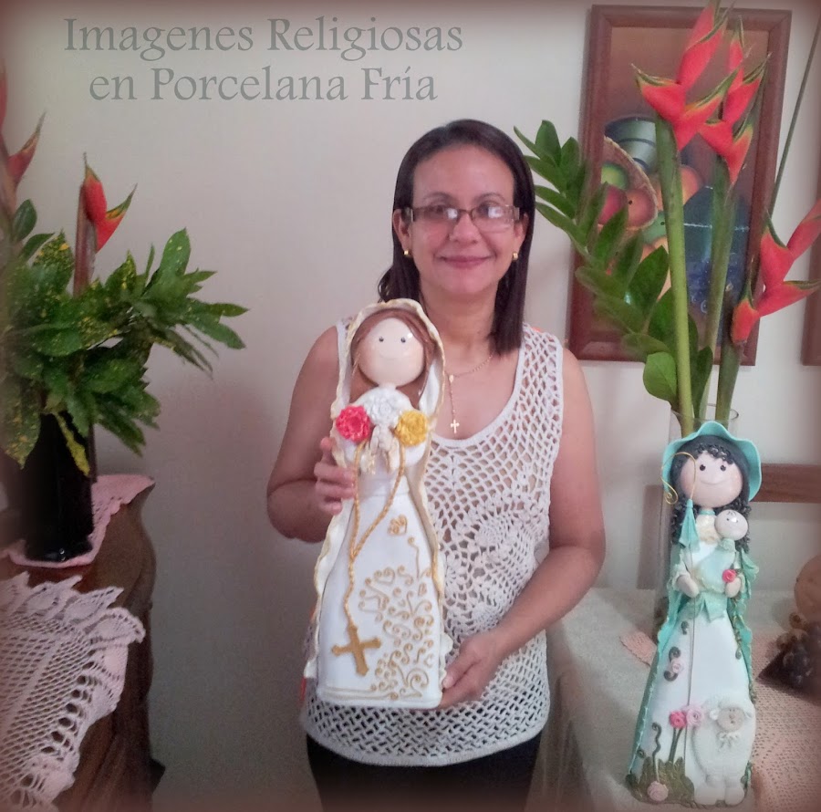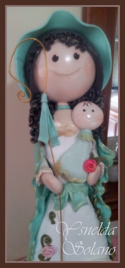 Como les he comentado antes, primero se empieza por los dibujos, diseñar las formas y tamaños de cada parte y luego llevarlo al material, o sea a la Masa Flexible o Porcelana Fría. Para mi fueron unas fases experimentales, que dieron como resultado estas dos virgencitas, una Divina Pastora y una Rosita Mística. Les comparto, con todo cariño, los frutos de este trabajo.