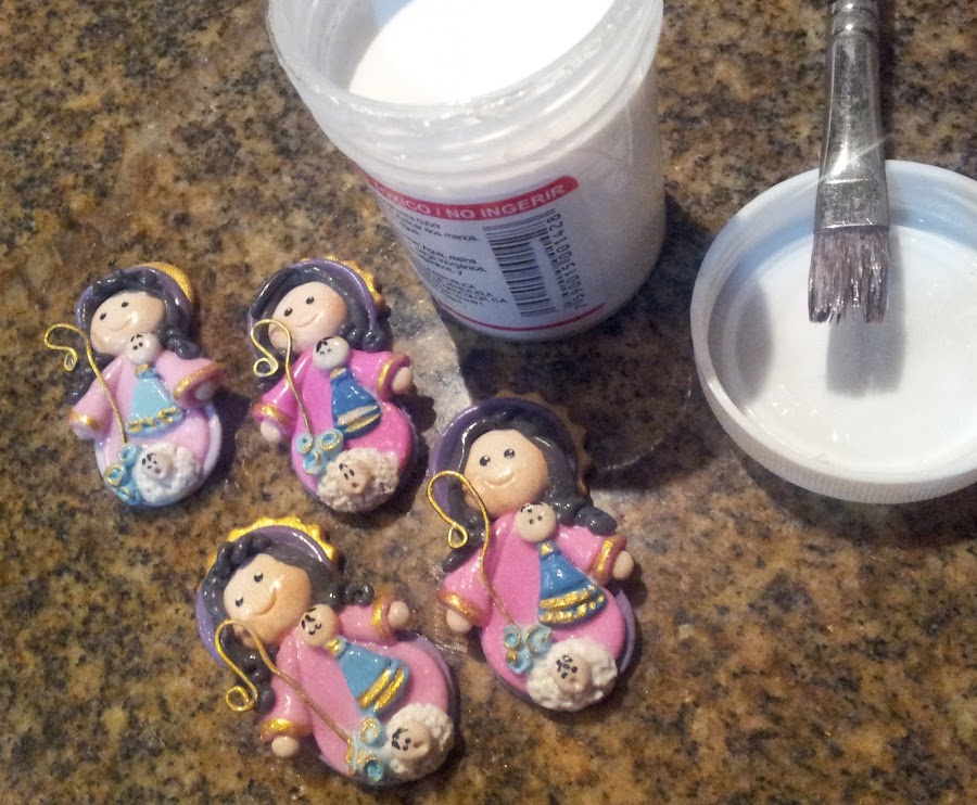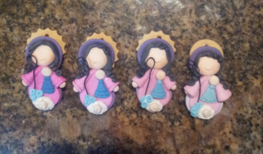 En especial estas cuatro las hice degradando los colores de los vestidos. Con porcelana fría pintada de rosado, azul y blanco, fui combinando cada vestidito de la virgencita y el bebe, para conseguir la degradación de colores.
