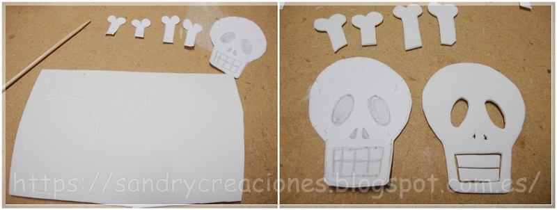 Otra opción (como en el caso de la visera de topos) sería dibujar y pintar la calavera con pintura acrílica blanca o con un rotulador permanente blanco directamente sobre la goma eva.