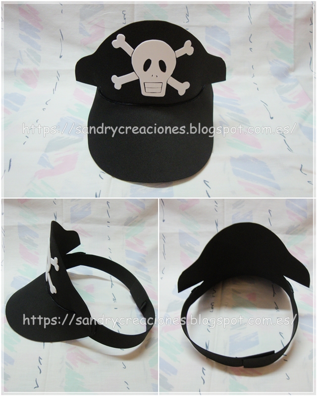 En la visera que simula un sombrero pirata, antes de pegar la parte de la visera, cortaremos los laterales para que una vez puesto el sombrero siempre quede recto y lo único que vaya alrededor de la cabeza sea la tira de la visera:
