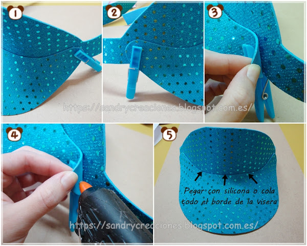 Paso 4. Montar y pegar las piezas de la visera. Para montar nuestras viseras solo tenemos que pegar la parte de la visera a la parte central de la tira que nos rodeará la cabeza. Para determinar más o menos dónde irá la visera podemos hacerlo centrándola a ojo o podéis poneros la parte de la tira en vuestra cabeza y pedir la ayuda de otra persona para que os coloque bien dónde debería ir la visera y os la sujete por las puntas con pinzas como hemos hecho nosotros (imágenes 1 y 2) y para que también os marque a lápiz o con el palo de brocheta la línea donde deberá ir pegada el resto de la visera (indicada por las flechas en la imagen 5). Una vez hecho esto, empezamos primero pegando las dos puntas de la visera con silicona caliente (imágenes 3 y 4) y después la parte central (imagen 5).