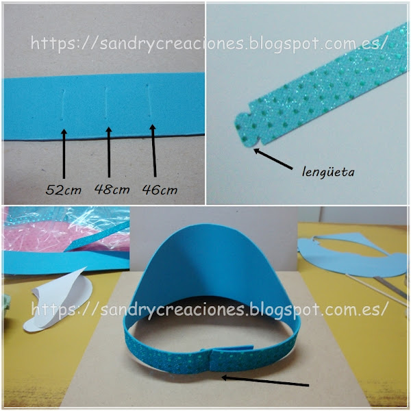 Paso 5. Cierre de la visera. Para el cierre de la visera, haremos uno o varios cortes en el lado de la tira que hemos dejado recto sin lengüeta, lo suficientemente grandes para que pueda entrar muy justa por ellos la lengüeta que hemos dejado en el otro lado de la tira. Nosotros optamos por hacer más de un corte para que así la visera se pueda adaptar a diferentes medidas de cabeza y escogimos las medidas 46cm, 48cm y 52cm de longitud de la tira tomadas desde la parte que termina en lengüeta sin contar la lengüeta. Para cerrar la visera solo deberemos introducir la lengüeta por uno de los cortes