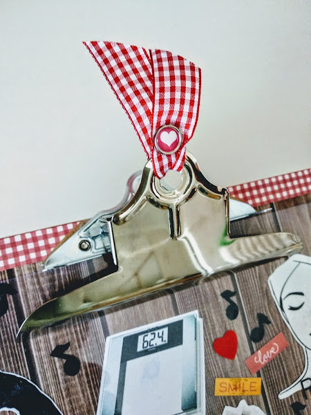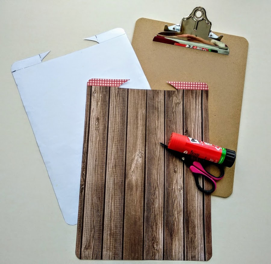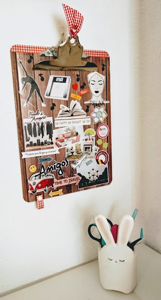 He utilizado un chipboard con pinza (he sacado la plantilla en un folio), papel que imita madera,