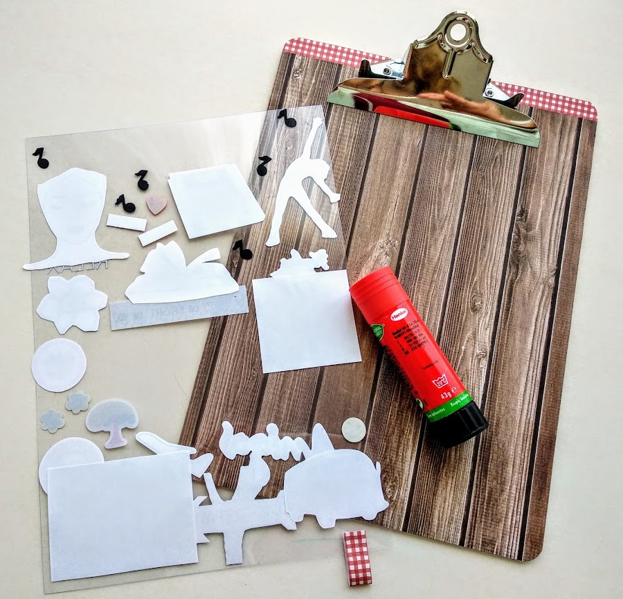 He sacado por la impresora imágenes de todo aquello que quiero poner en mi tablero, las he recortado y pegado por la parte de atrás de la lámina de acetato con un punto de pegamento de barra.