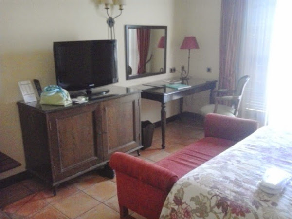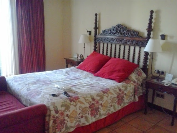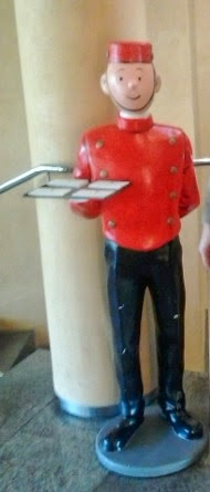 Lo primero, dejar las maletas. El hotel estaba en Castelldefels, en la montaña, exteriores bonitos, decoración clásica y habitación espaciosa. En recepción formando parte de la decoración se encuentra este simpático botones.