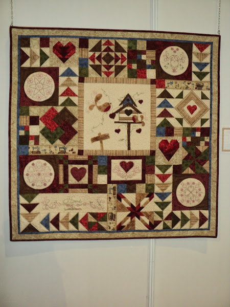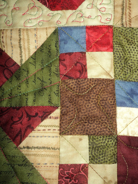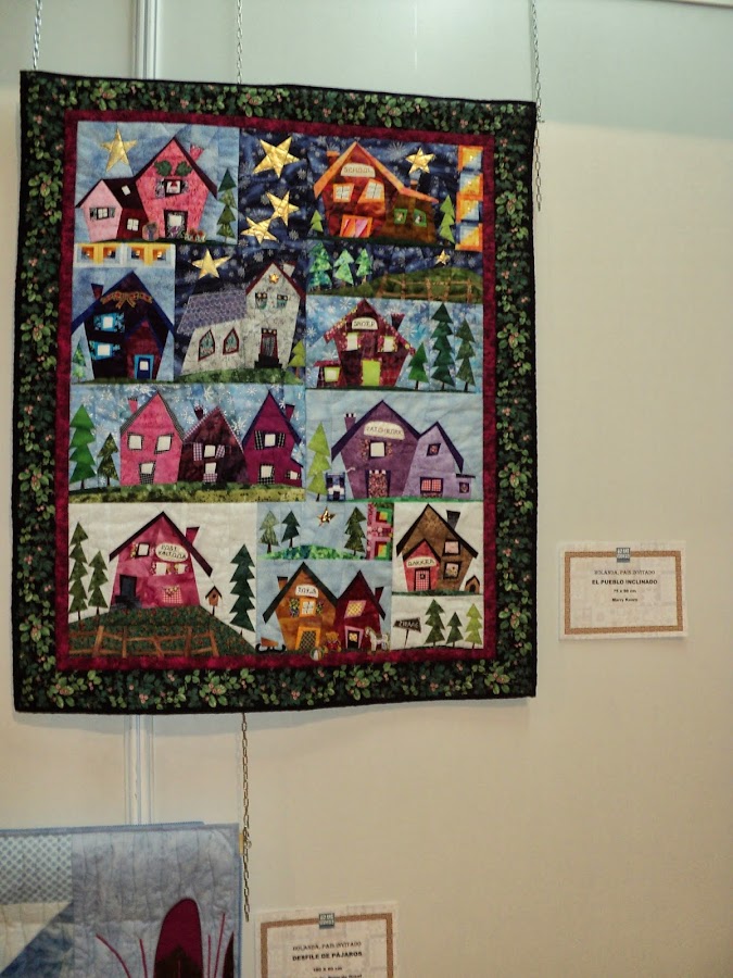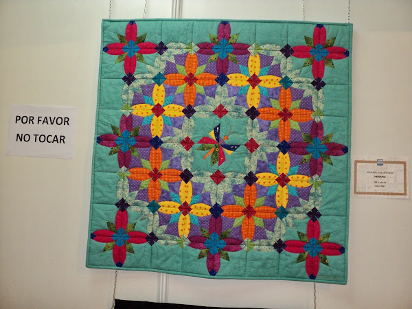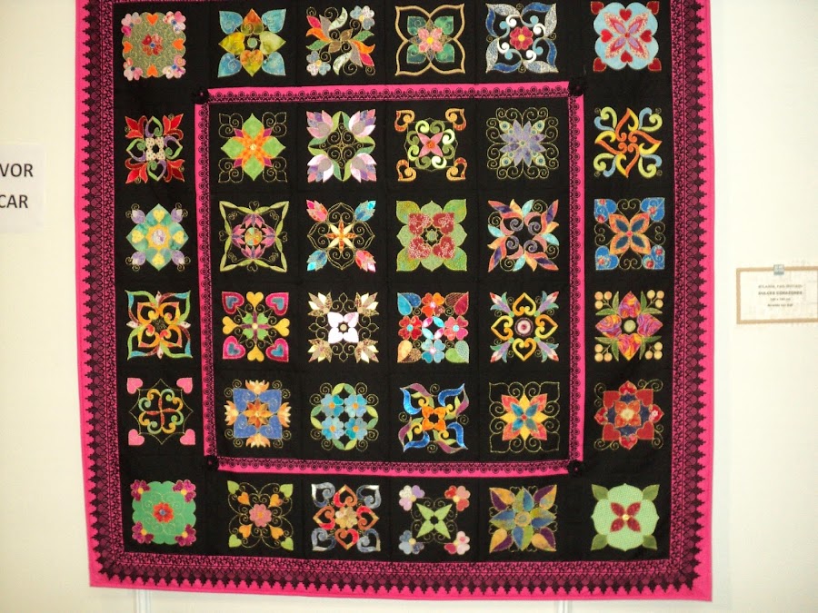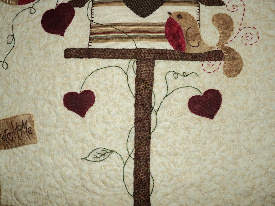 En esta fotografía del quilt anterior, quería enseñaros el acolchado, en este caso a maquina. En la que hay debajo podéis ver el centro del quilt en el que hay bordados, aplicación y un acolchado muy tupido.