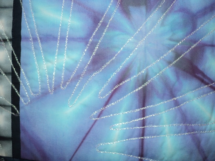 Esta obra si tiene un titulo que no sé relacionar "Diente de león" Su autora es Nienke Smit y mide 115 x 115 cm. En la fotografía inferior se ve el detalle de las lineas que están resaltadas con hilo de plata. No tiene puntadas de acolchado visibles.