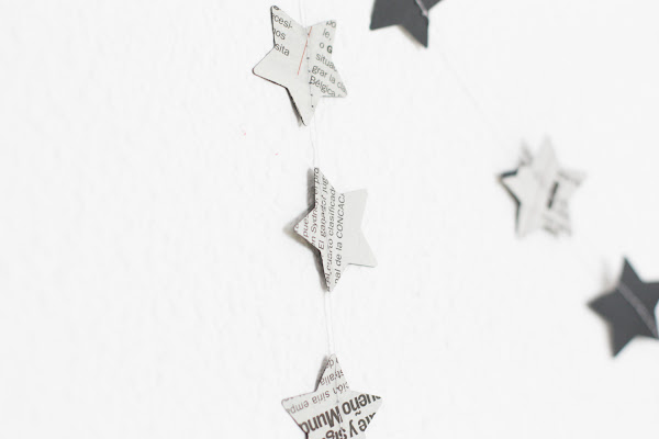 5. Guirnalda: Unas hojas de papel de periódico, una troqueladora con forma de estrella y un poco de costura. Si tienes todo esto, tienes una guirnalda la mar de bonita y súper original sin gastar un duro. Quien dice troqueladora, dice buena mano con las tijeras, y quien dice estrellas, dice también corazones, coronas o renos...
