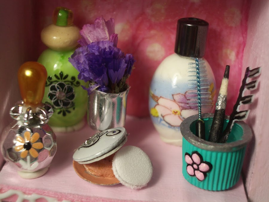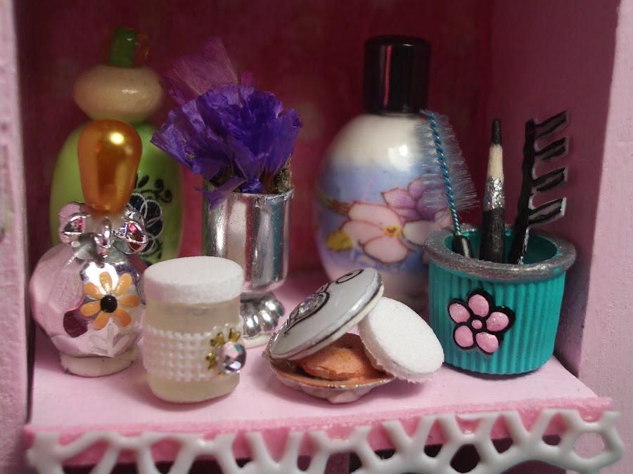 En esta vitrina podéis comprobar que no falta nada: botes de crema, perfumes, sales de baño, polvera, pintalabios,...