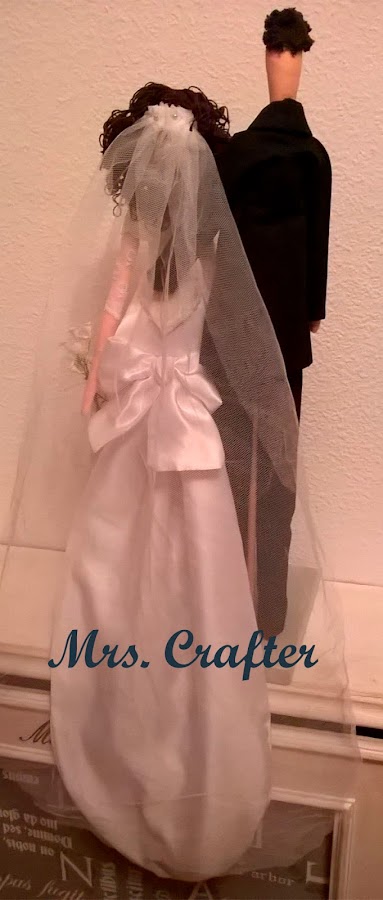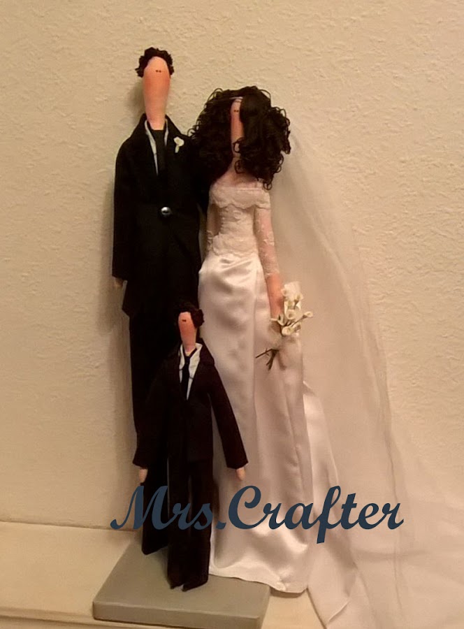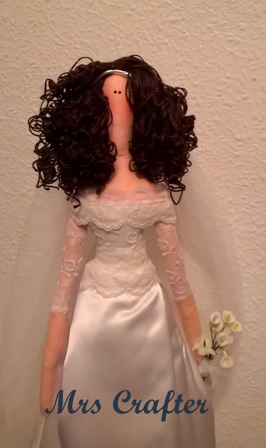La novia me encanta, lo siento, chicos, pero también en versión tilda el novio luce menos que la novia. El vestido era un tanto complicado en la parte superior, por lo que tuve que hacer varias pruebas, y por detrás, un gran lazo donde empezaba la cola, todo ello cubierto por el velo hasta el final de la cola. Cabello largo, ondulado, con una pequeña tiara plateada. Conseguí encontrar calas para el ramo y las solapas de los chicos, que era la flor que ellos habían escogido.