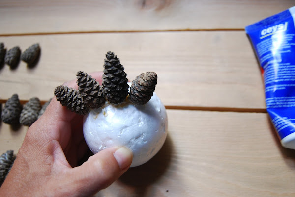 La parte más latosa es precisamente esta, pegar las piñas, porque no se pueden pegar de golpe o se acaban desmorronando, así que hay que pegarlas poco a poco, en grupos de cuatro o cinco, esperar a que seque el pegamento y volver a pegar otras. Yo lo que acabé haciendo fue dejar la bola con el pegamento encima de una mesa y cada vez que pasaba iba pegando un par de piñas, y así hasta completar la bola... Recordad que hay que dejar un pequeño espacio para que luego podamos introducir el palo/tronco.
