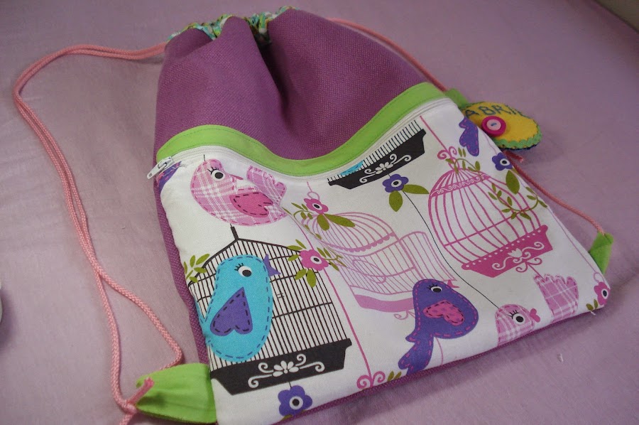 Y por si acaso, para ganar algo de espacio le coloqué también un bolsillo exterior que es toda la parte de la tela de pájaros y jaulas.