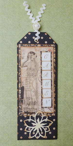 El otro lado del marcapáginas lo adorné con un papel de la misma colección troquelado con la troqueladora "Doily Lace" de Martha Stewart. Una pizca de brillo con Stickless plateado, y un simpático perro con más toques de Glossy. La flor tiene una base de fieltro, un troquel de Martha Stewart y un pebble casero en el centro con cuadritos vichy como en la parte posterior. Un trozo de piquillo fucsia, y un charm de Snoopy para rematar la temática canina.