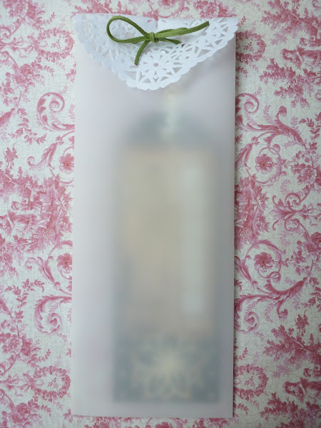 En la última imagen podéis ver cómo entrego estos trabajos. El sobre está hecho con papel cebolla, y lo remato con una blonda. Dos agujeros hechos con Crop A Dile, y una lazada verde lo cierran. Es una forma muy sencilla que da un aspecto impecable.