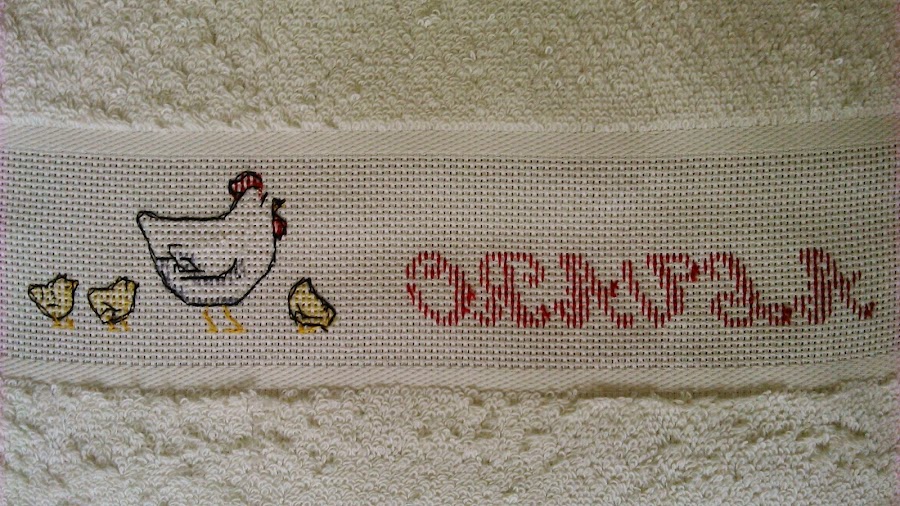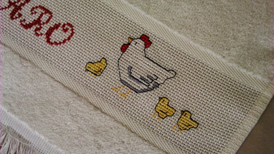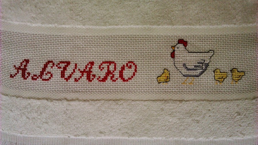 Entre la enorme lista de materiales que nos pidieron desde el colegio, que parece que vaya a estudiar bellas artes en lugar de educación infantil, estaba una pequeña toalla. Y ya que había que llevar una toallita pues vamos a llevar una bien chula, bordada a punto de cruz, con su nombre y una gallina con sus pollitos, animales que le encantan.
