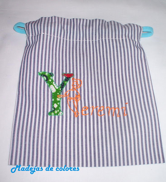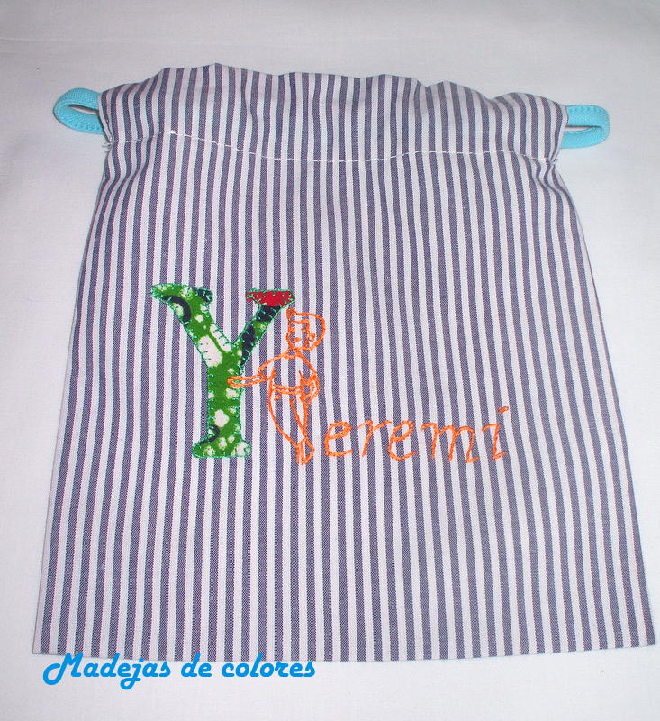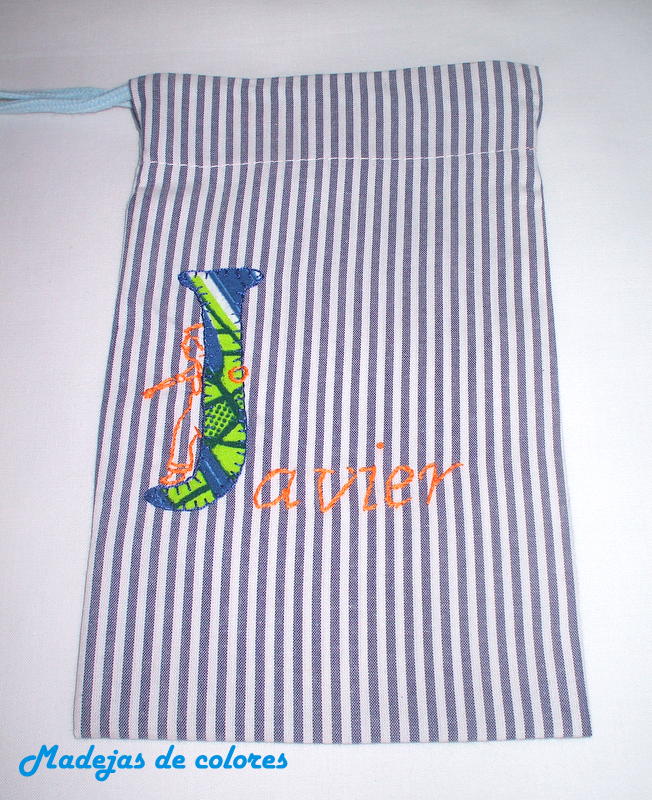 Sobre una tela de rayas azules, apliqué en tela la letra J y el resto lo bordé en punto tallo y color naranja, para que destacara. Como cierre el mismo cordón.