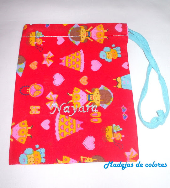 Para la mayor llamada Nayara, escogí esta tela tan alegre, llena de muñecas. Como no necesita más adorno, le bordé sólo su nombre en punto cadeneta. Y para cerrar cordón turquesa.