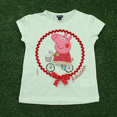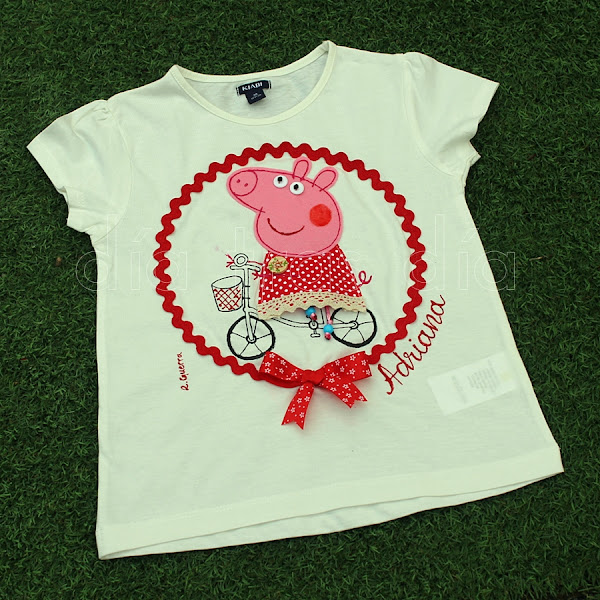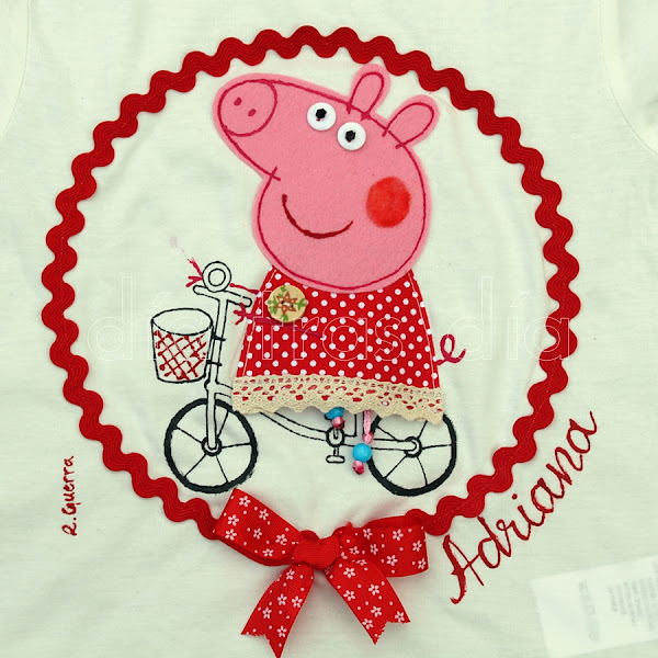 Así que por aquí os dejo algunas fotos para que veáis como resultó la camiseta para la pequeña Adriana, con Peppa montada en bicicleta: