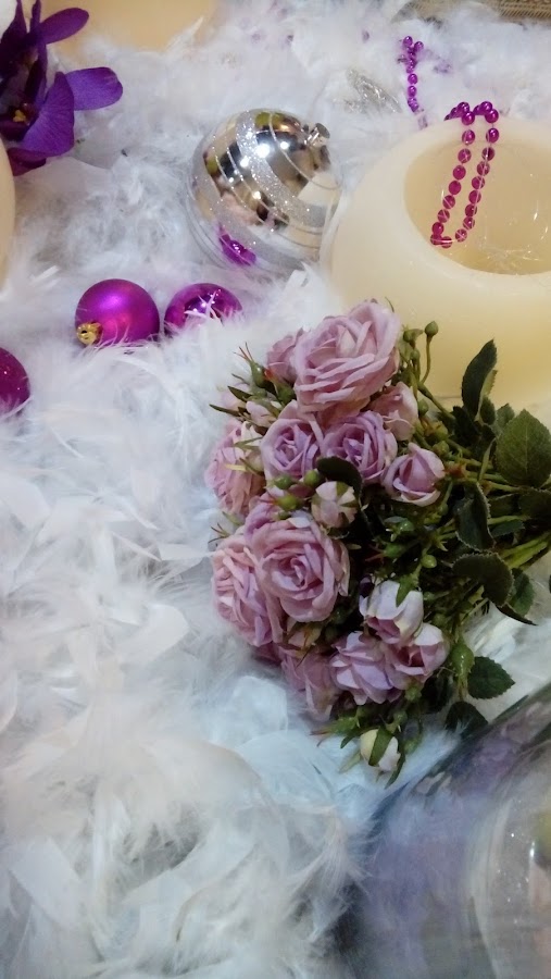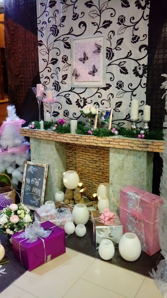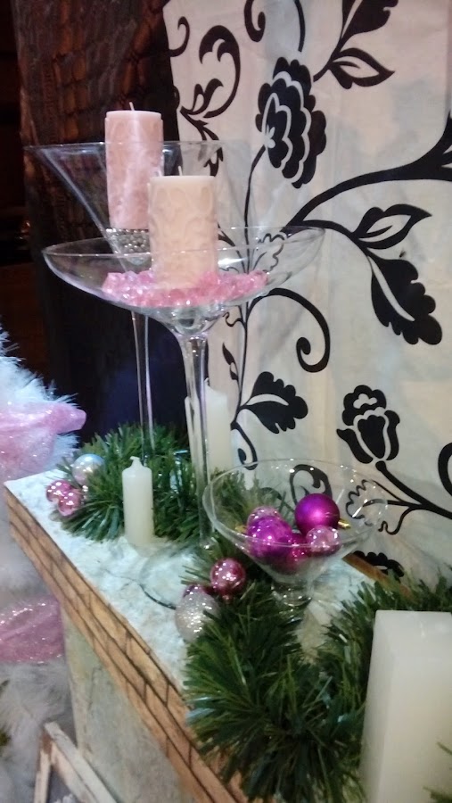 Poco a poco hemos ido incorporando más y más detalles, cajas de regalos, velas, leños para la chimenea, y todo en tonos que van del rosa cuarzo hasta las gamas de rosas más fuertes y morados, con plateados