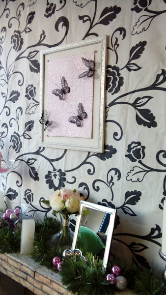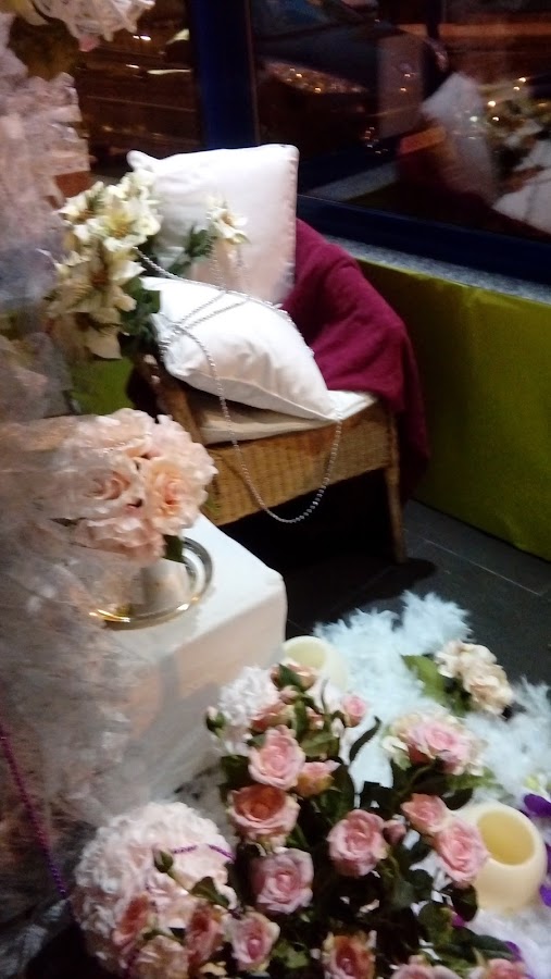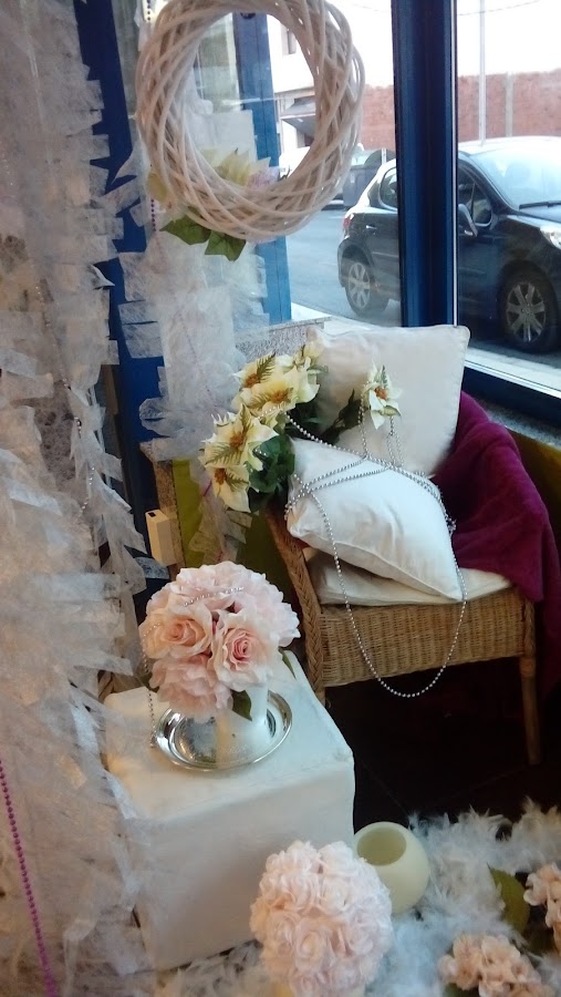 Se han colgado unas guirnaldas hechas con tul blanco del escaparate con unas perlitas entrelazadas en rosa y plata para crear así un fondo que enmarque un poco todo el trabajo y conforme más una estancia