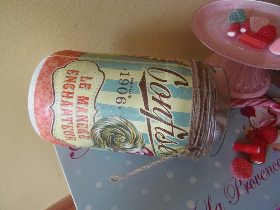 De paso os enseño este tarro que hice con un líquido que permite hornear el decoupage y poder lavarlo,ya lo había probado aquí,