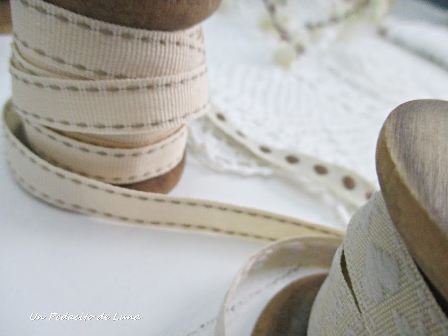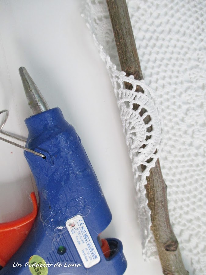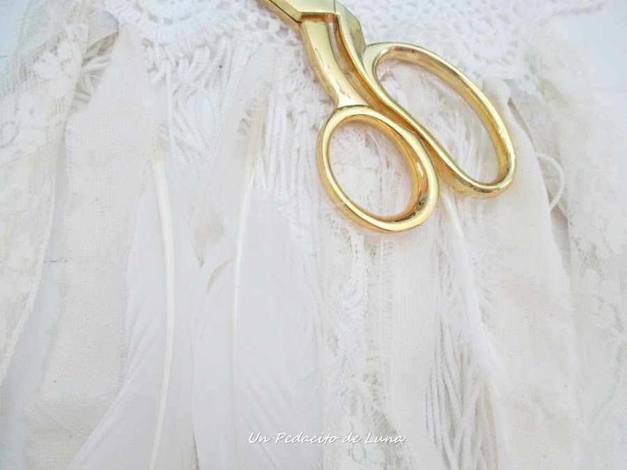 Poco a poco cintas, encajes y plumas fueron dando forma al colgador de forma armónica.