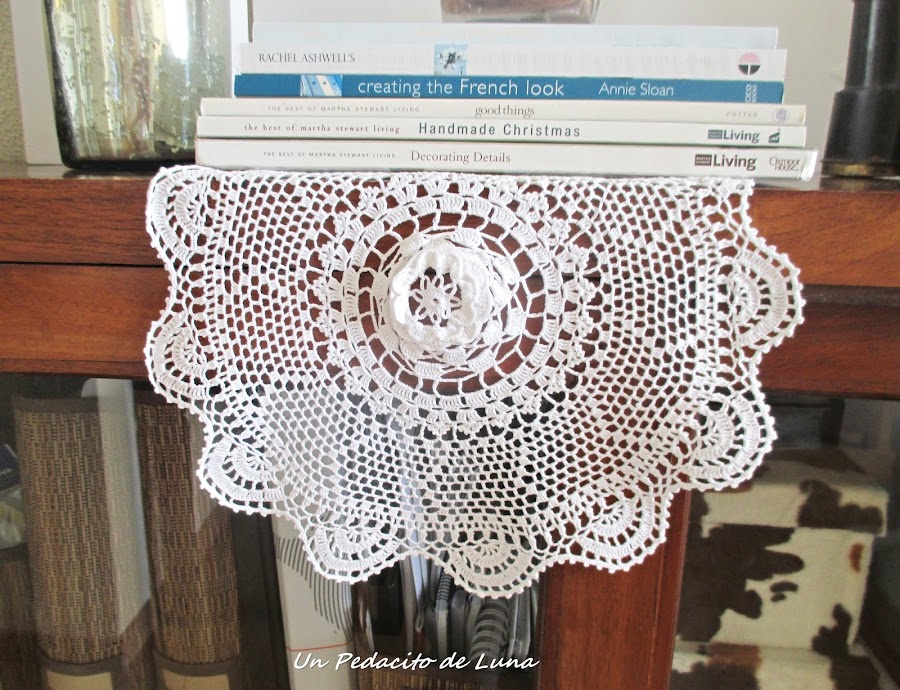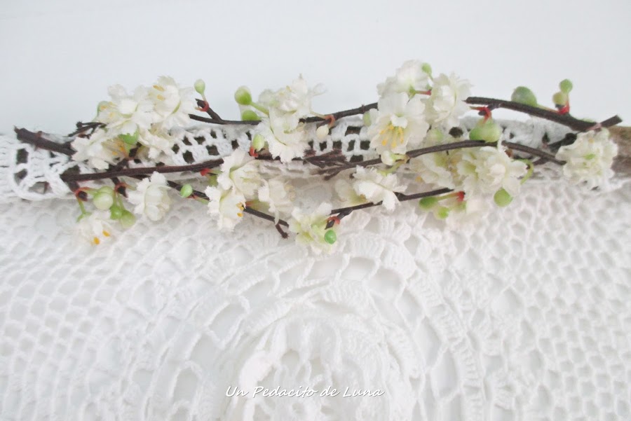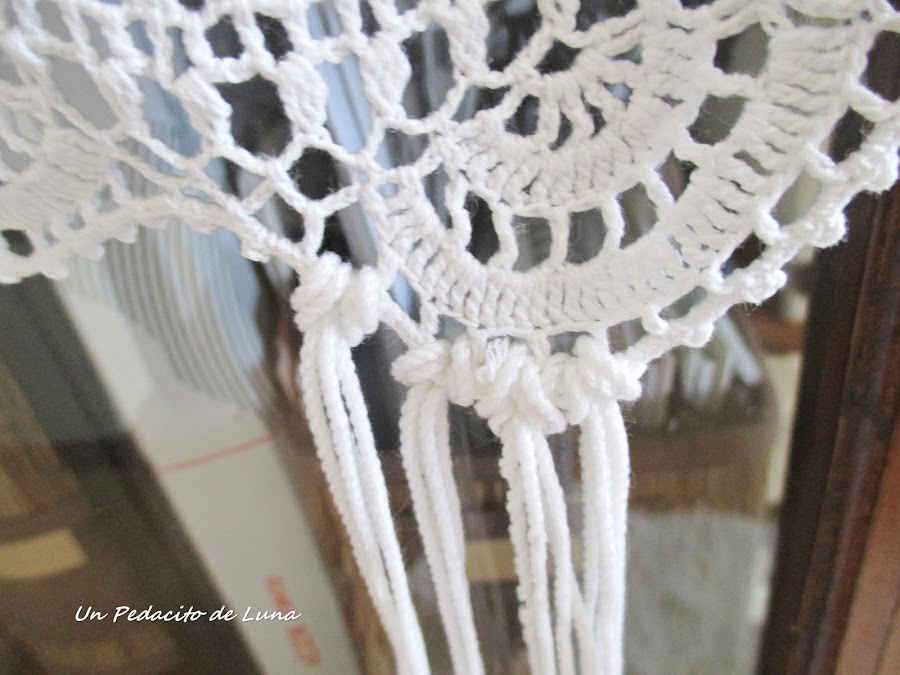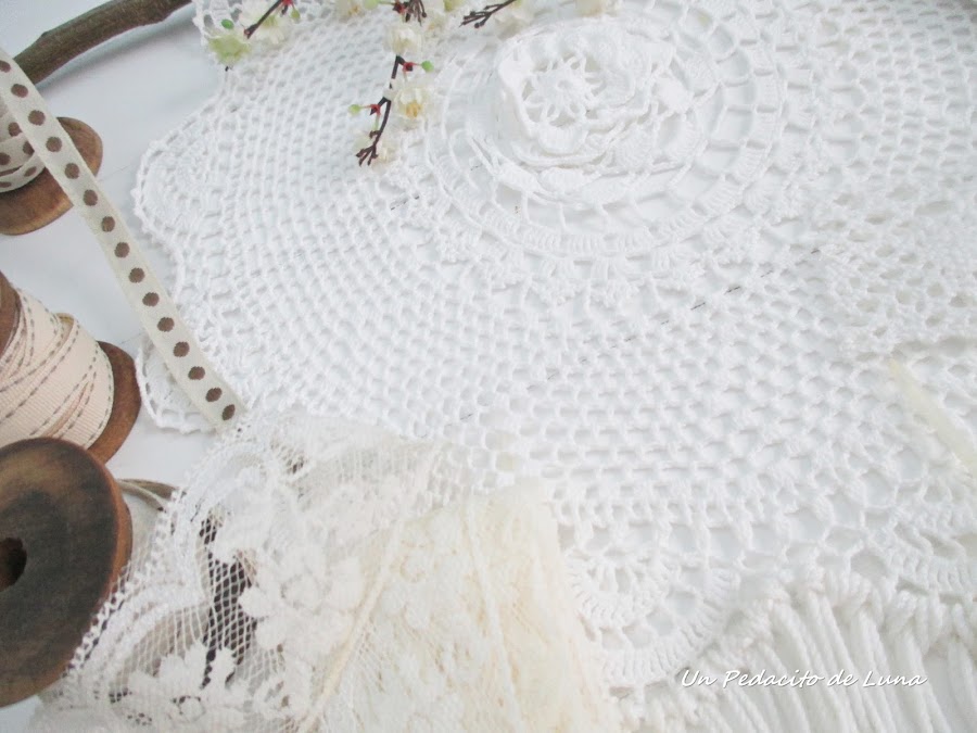 Para ello me he valido de un rosetón de crochet que tenía en casa (no lo hice yo) y una bobina de algodón blanco.