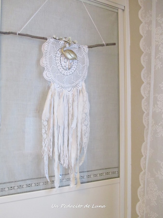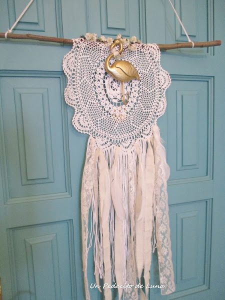 Para terminar recordé un percherito metálico de flamingo que esperaba alguna ocasión para salir a dar un paseo y también quedó enganchado al rosetón con una lazada que pasé por detrás y pegué con algún punto de silicona.
