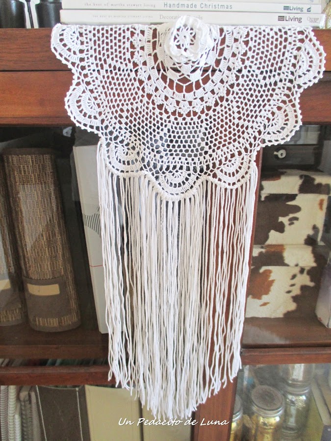 Corté de la bobina unas tiras largas para hacer unos flecos que fui engarzando en el borde del paño de crochet.