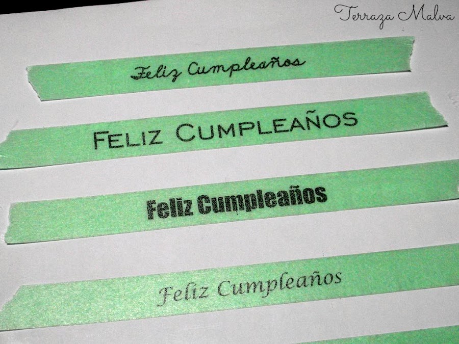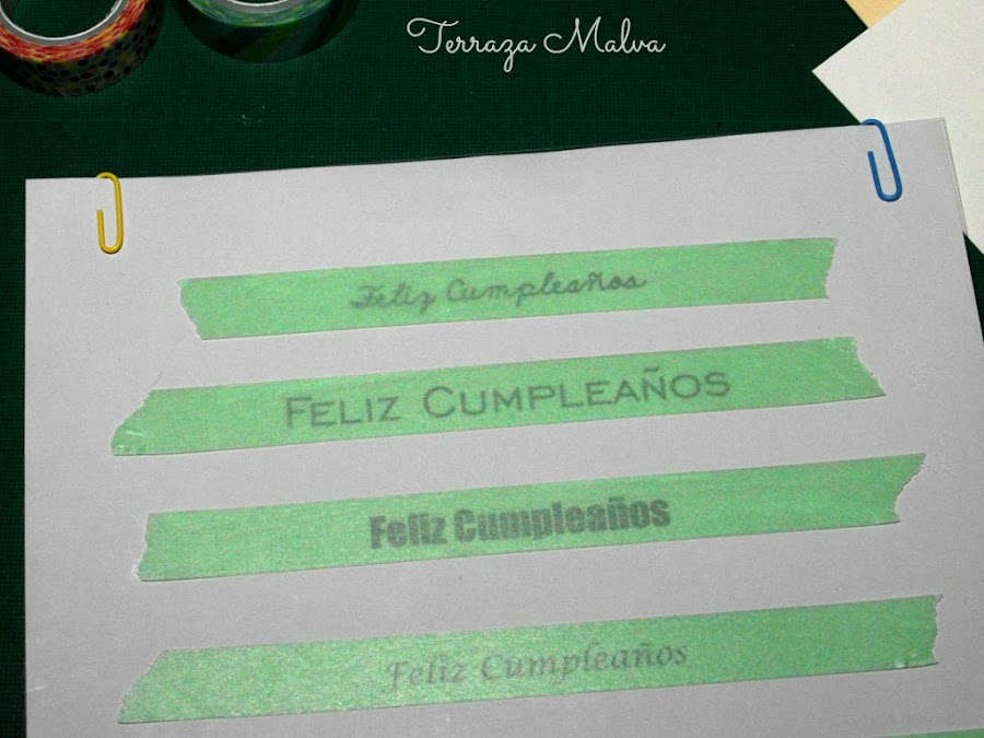 Se comienza haciendo la impresión del texto que se quiera en una hoja normal. Yo he probado con varios tipos de letra para luego elegir el más apropiado para el trabajo donde usar el washi tape (en mi caso una tarjeta de felicitación de cumpleaños....)