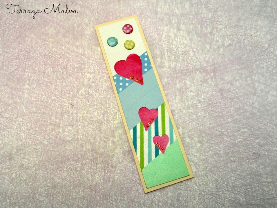 Para el marcapáginas he procedido de manera similar, utilizando la base en color crema y montando dos cartulinas blancas, una con los corazones troquelados sobre otra con el color rojo. Tanto en la tarjeta como en el marcapáginas el color lo he aplicado con un tampón para sellos que ha dejado una textura bastante curiosa, como de tiza.