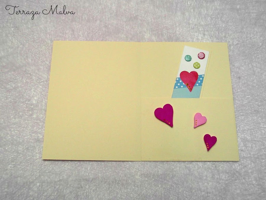La tarjeta tiene un bolsillo interior para sujetar el marcapáginas. Para adornar el bolsillo he utilizado los corazones que troquelé en la tarjeta, a los que he dado color con rotuladores Tombow ABT y he situado con unos adhesivos 3d para dar volumen.