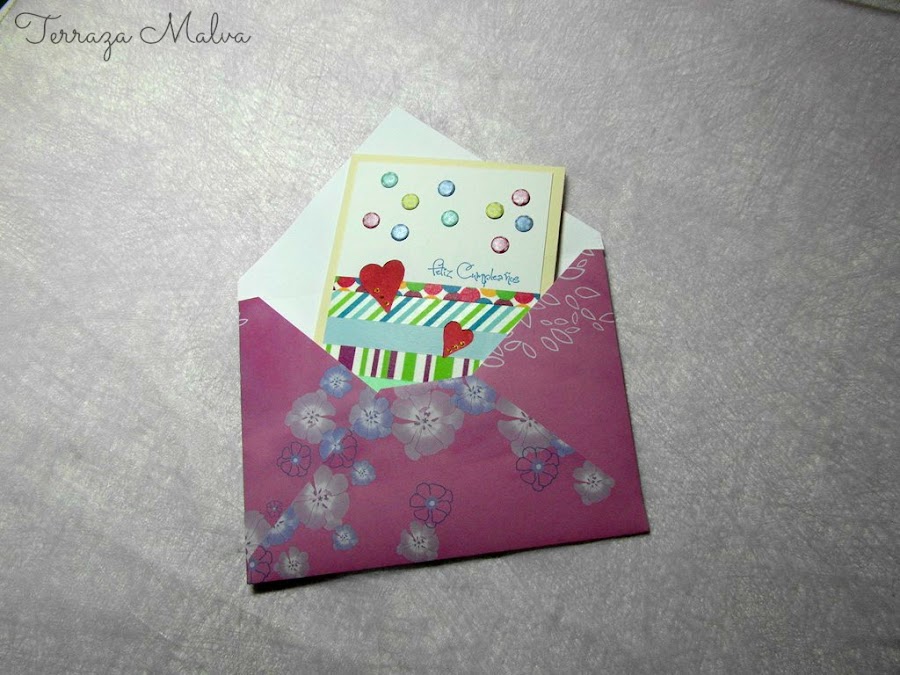 Por último he realizado el sobre para la tarjeta con mi Scoreboard y un bonito papel de scrapbooking de una colección floral. Listo para entregar !!!