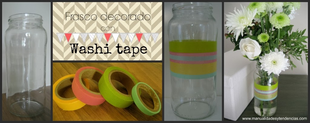 ¡Buenos días! El otro día me regalaron flores pero no tenía ningún jarrón donde ponerlas, así que decidí reciclar un frasco de vidrio y utilizarlo en su lugar. Para darle un toque personal y más alegre usé washi tape de colores verde anís, amarillo, rosa y azul turquesa. En la foto de abajo podéis ver el paso a paso completo.