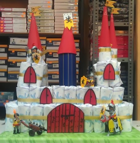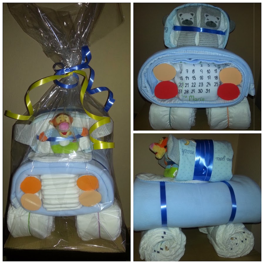 Pero no todo se queda ahí porque también nos gusta realizar otros pequeños regalitos para el peque. En el caso del cochecito lleva un body pintado a mano integrado en el coche, en el "maletero", y está compuesto por una manta, otro body, un babero, dos pares de calcetines un sonajero y muuuchos pañales!! y el castillo es todo de pañaes pero lleva unos cuantos regalitos escondidos en las torres y en el interior del castillo.