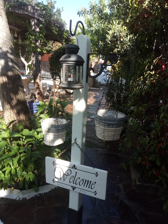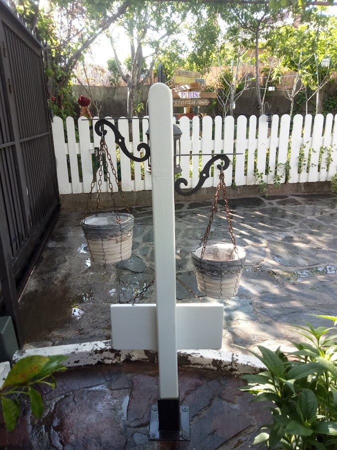 A lo que iba, el letrero en cuestión, una imagen de Pinterest y a partir de ahí... un trozo de palé (que de eso nos sobra por todas partes y el juego que dan), un poste de jardinería, plantilla hecha con la Cameo, pinturas, soporte para agarrar al suelo, dos escuadras para plantas, unas cestas kukis para colgarle unas plantitas, un farolillo que no encontraba sitio por su color, un sobrante de soporte para colocar faroles en el suelo del jardín, que no podemos colocar porque nuestro perro (un San Bernardo de mas de 70kg con complejo de gacela y algo vegetariano) en vez de llamarle Sheldon (ya os dije que somos unos frikis) teníamos que haberle puesto Othar, el caballo de Atila.... Y manos a la obra¡¡