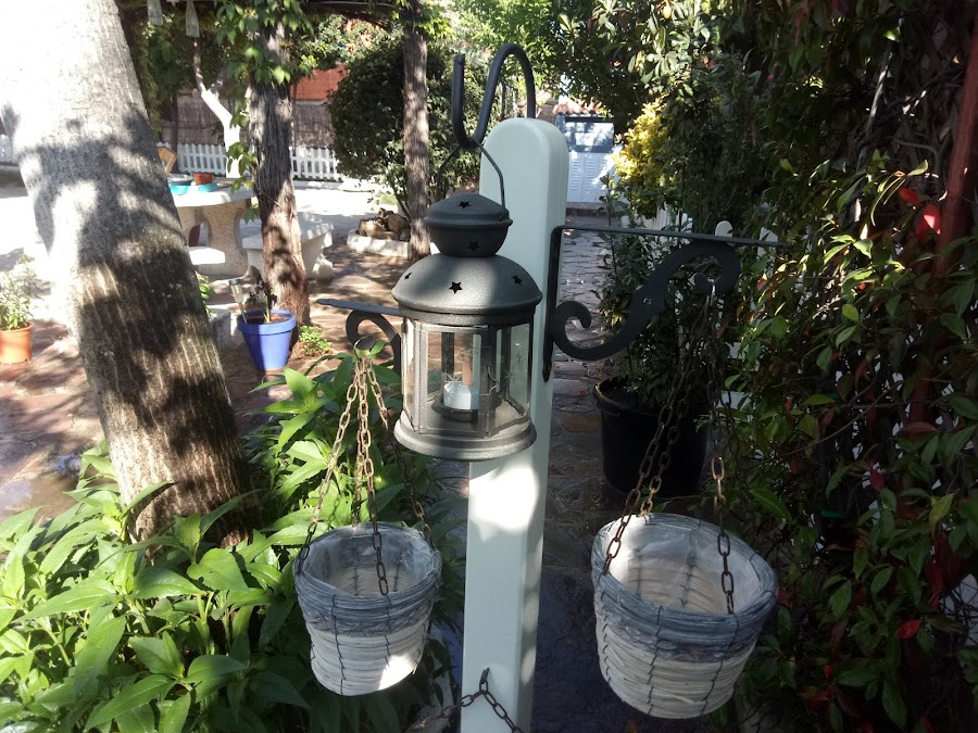 Aquí se aprecia mejor el soporte para el farolillo, en vez de en el suelo, en lo alto del poste, aqui seguro que no lo arranca... Bueno, ahora que lo pienso, eso también tuvo su momento complicado, porque hacerle el agujero bien centrado en una superficie tan pequeña y de forma redondeada tuvo su aquel, pero mi manitas particular es un crack