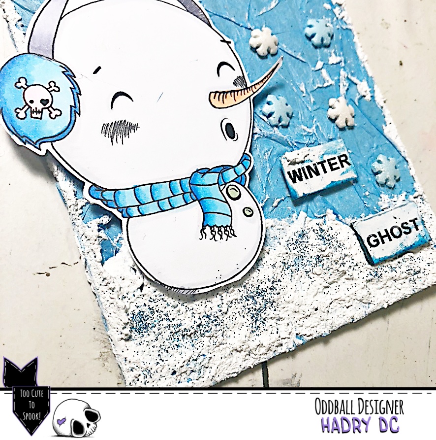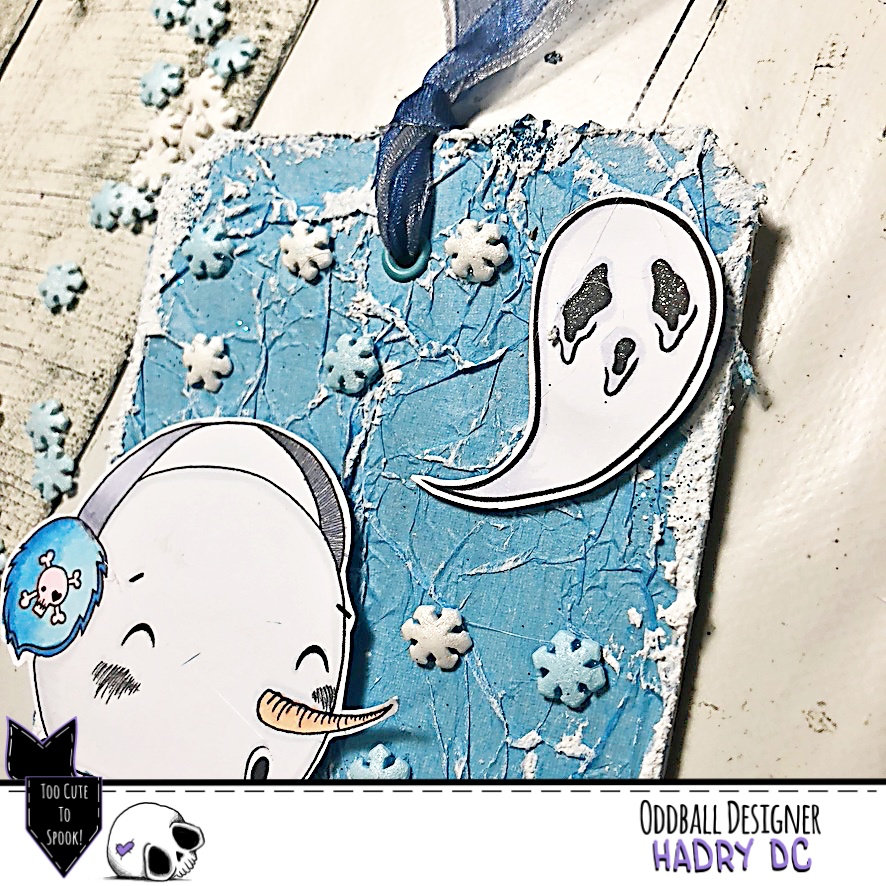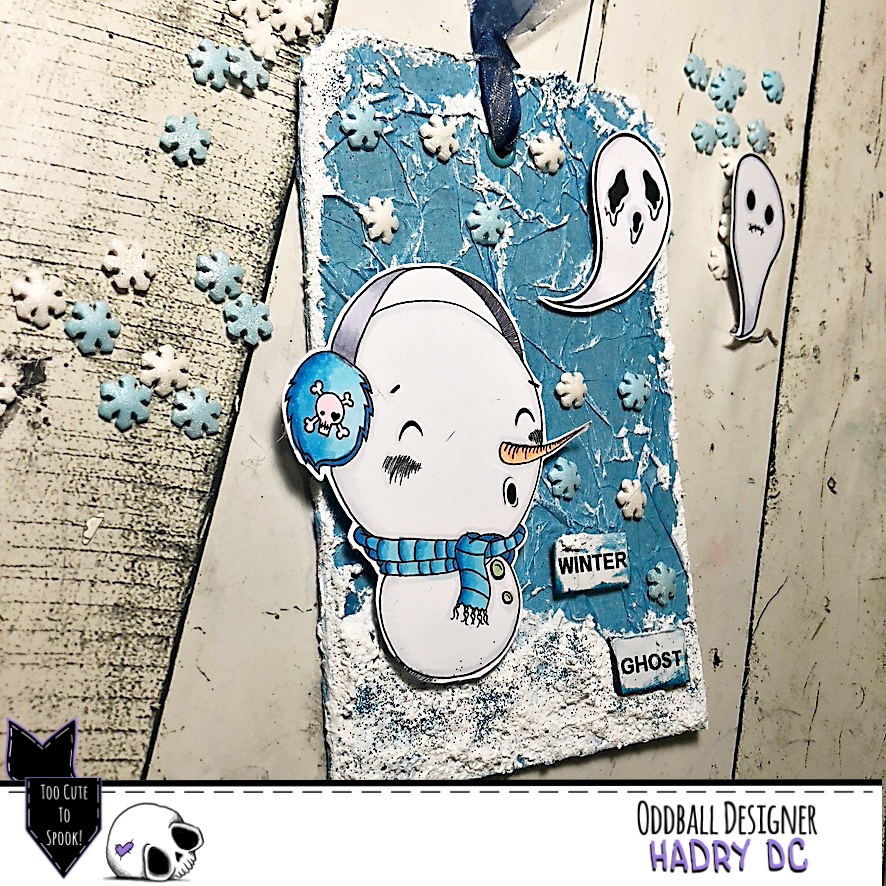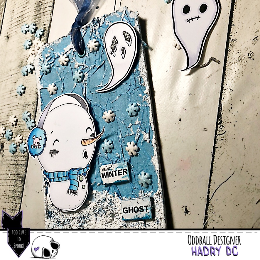 He creado un tag en tonos azules, con un fondo de papel de seda, pasta efecto nieve, purpurina y copos de nieve.