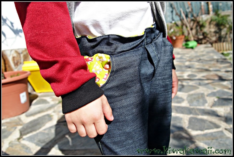 La cintura con un elástico interior muy grueso para que sean cómodos. La tela tejana es de Encants, la de setas fue un regalo de hace tiempo.