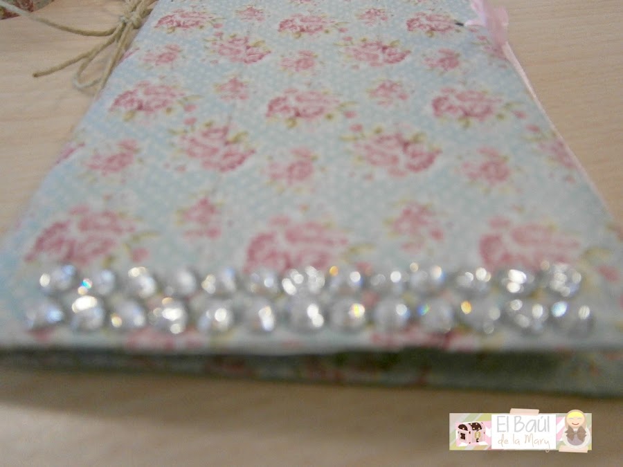 Para terminar, nosotros le hemos hecho unos agujeritos para pasar un lazo y que nuestra libretita quede así cerrada, y unas pegatinas brillantes en la solapa delantera, pero eso ya es al gusto.