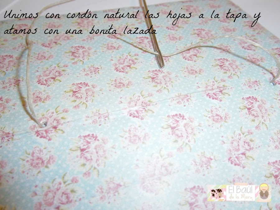 Ahora, solo nos queda unir los folios a nuestra bonita portada. Para ello, hacemos un par de agujeros y con ayuda de una aguja gruesa o sin nada si os resulta fácil, pasamos el cordón de fuera hacia adentro. Atamos con una bonita lazada, y ya casi tenemos lista nuestra libreta!