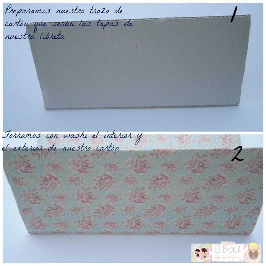 Ahora solo nos queda forrar con washi todo el cartón. Nosotros hemos forrado primero la parte que quedará por fuera de la libreta, doblando el washi un poco hacia adentro. Luego hemos forrado la parte interna, dando así uniformidad a toda la libreta.