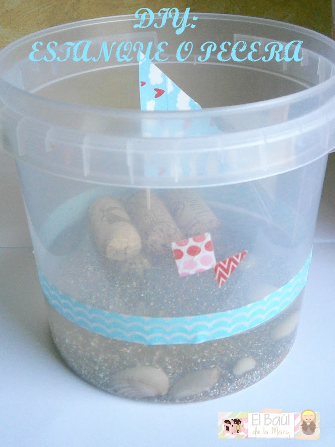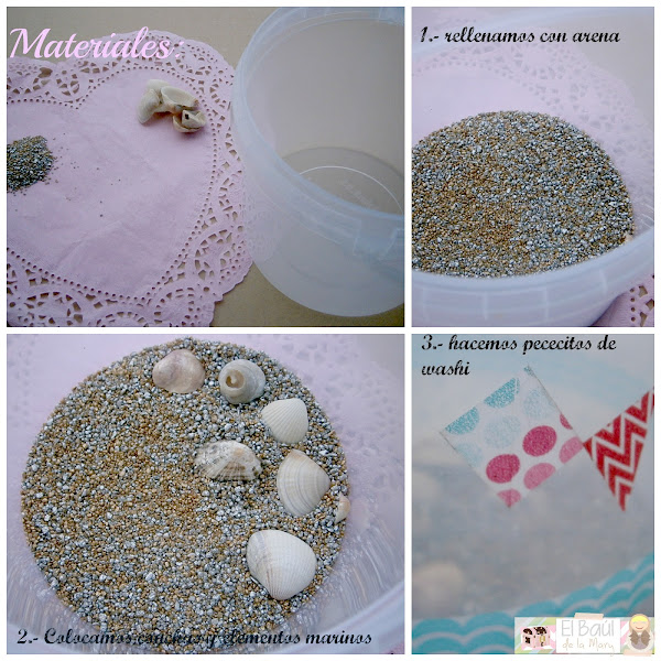 ¿Habéis visto que sencillo es? Solo necesitareis un viejo recipiente grande de plástico (mejor para que los peques no lo rompan), vuestros washi favoritos para hacer algunos adornos a nuestro recipiente (la idea de los peces la vimos en su día en el blog de Chris, Little Hannah) y un poquito de arena y algunas conchas para hacer nuestro fondo marino.