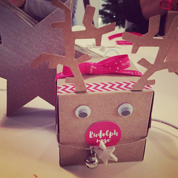 Durante el evento tuvimos tiempo de realizar tres talleres. El primer taller consistía en crear un reno monísimo y super fácil de hacer: sólo necesitas una caja, unos ojos, una pegatina roja y unos cuernos que puedes hacer tu mismo con papel. Y el resultado... Este precioso reno!