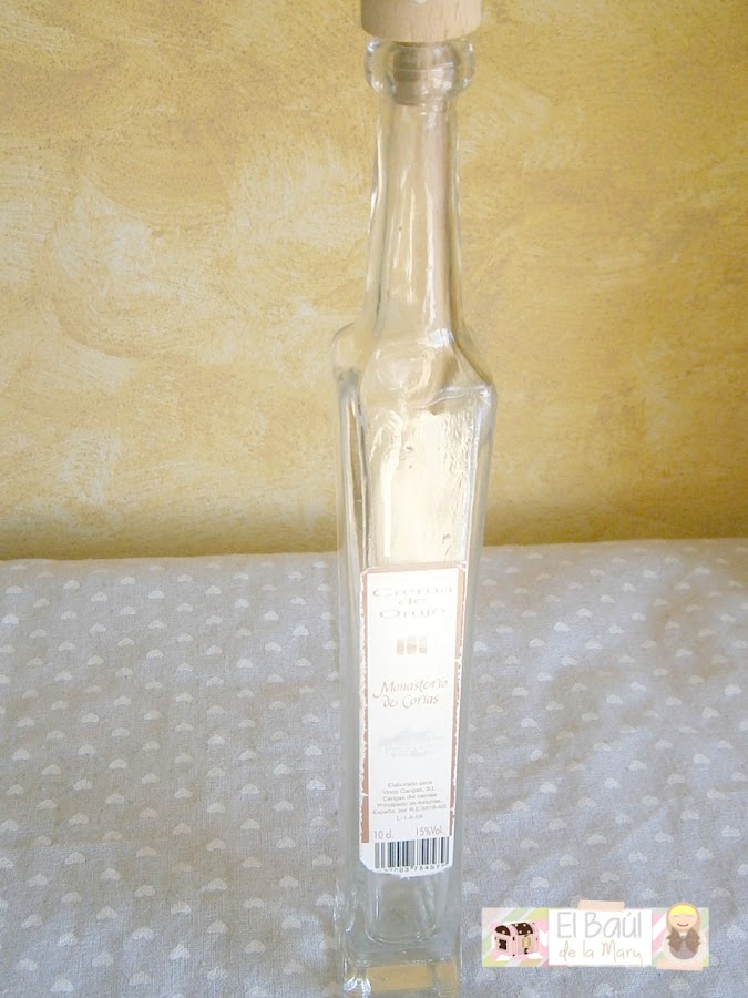 Lo único que necesitamos es una botella estrecha, esta es de un regalo de comunión, y llevaba ya unos añitos esperando turno (no os exageramos, es de una comunión de 2009, nuestro síndrome de diógenes, viene de lejos!)