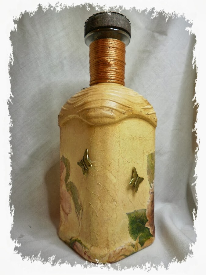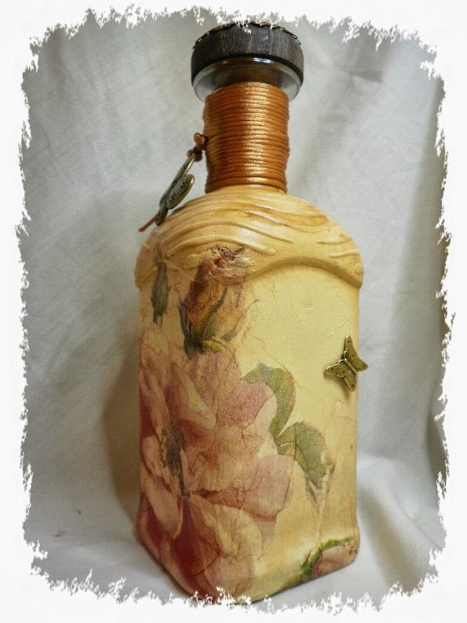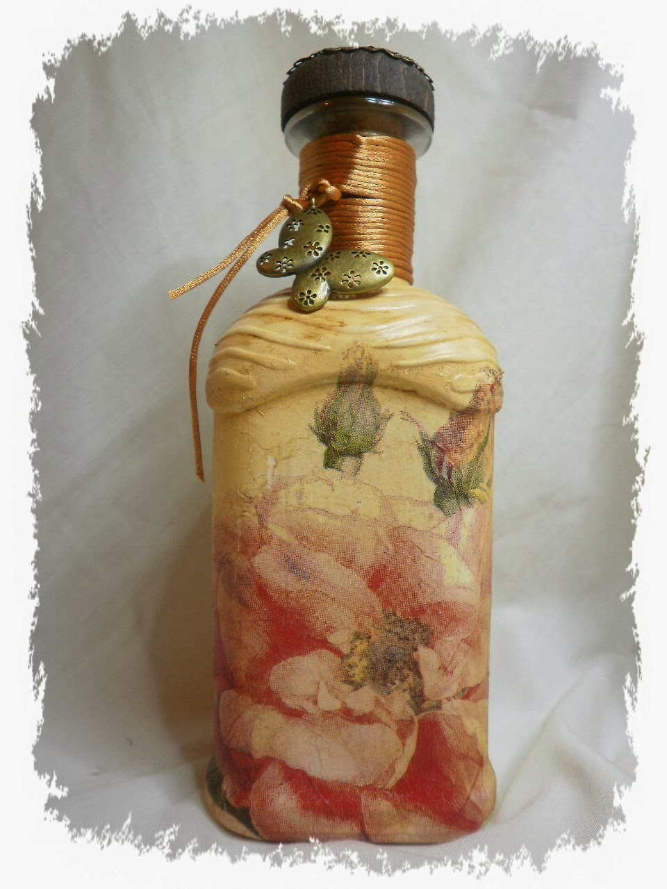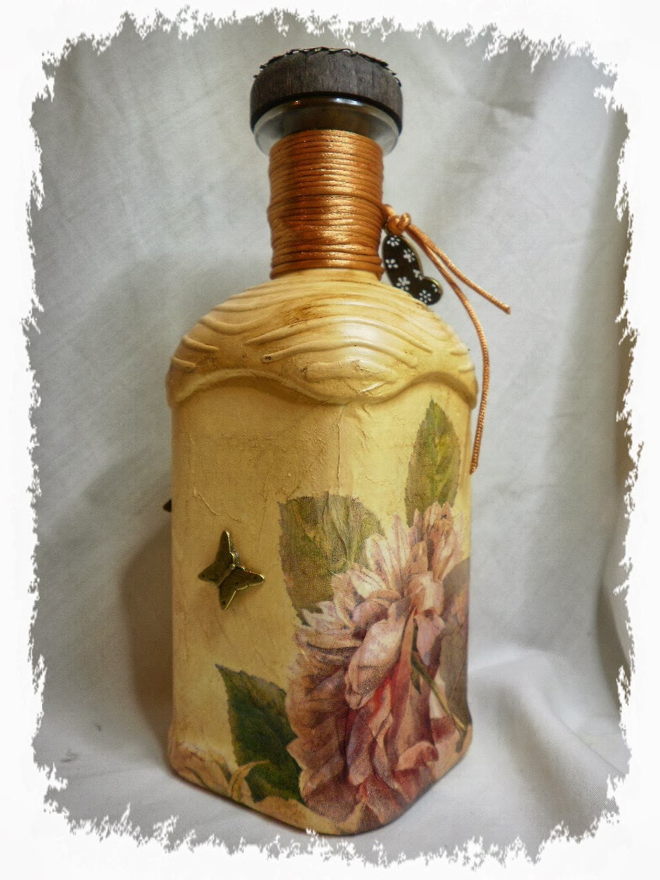 Este trabajo surgió de repente. Las necesita para YA y como soy muy cabezona... pues manos a la obra Esta está realizada además del decoupage, con sello, tinta transparente y polvos embossing dorados( y por supuesto pistola de calor). Por cierto,bastante difícil poner el sello en la botella, sobre todo en su zona curva. Cuello de la botella con cola de ratón y adorno metálico e ...