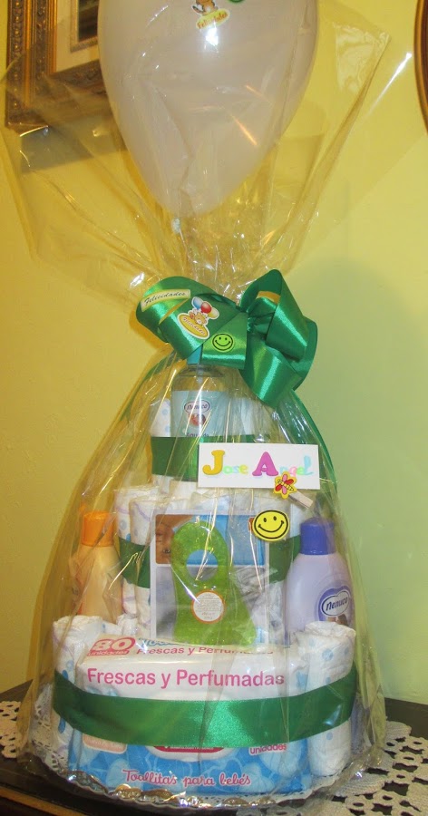 Otra bonita tarta de pañales que ha ido a casita de Jose Angel para que sus papis hagan buen uso de las cosicas que lleva incluidas .
