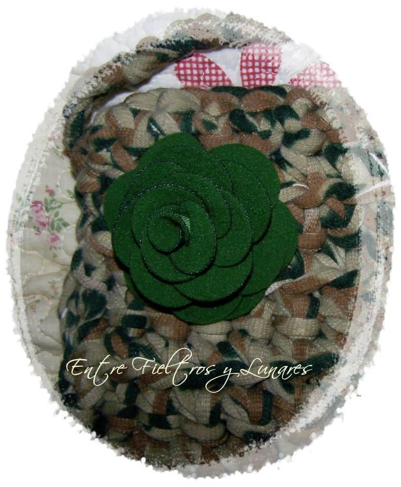 Bolso en trapillo "camuflaje" tipo bandolera, con detalle de rosa en fieltro verde...