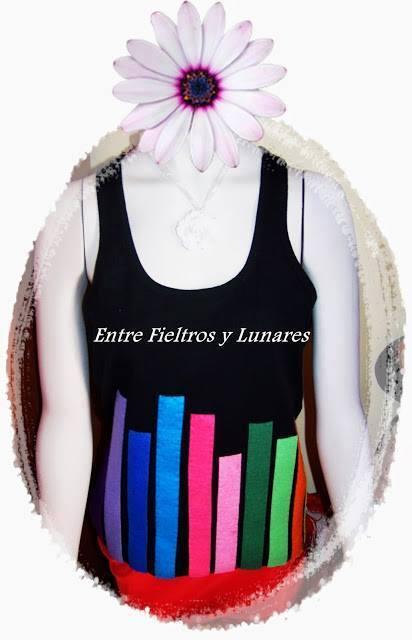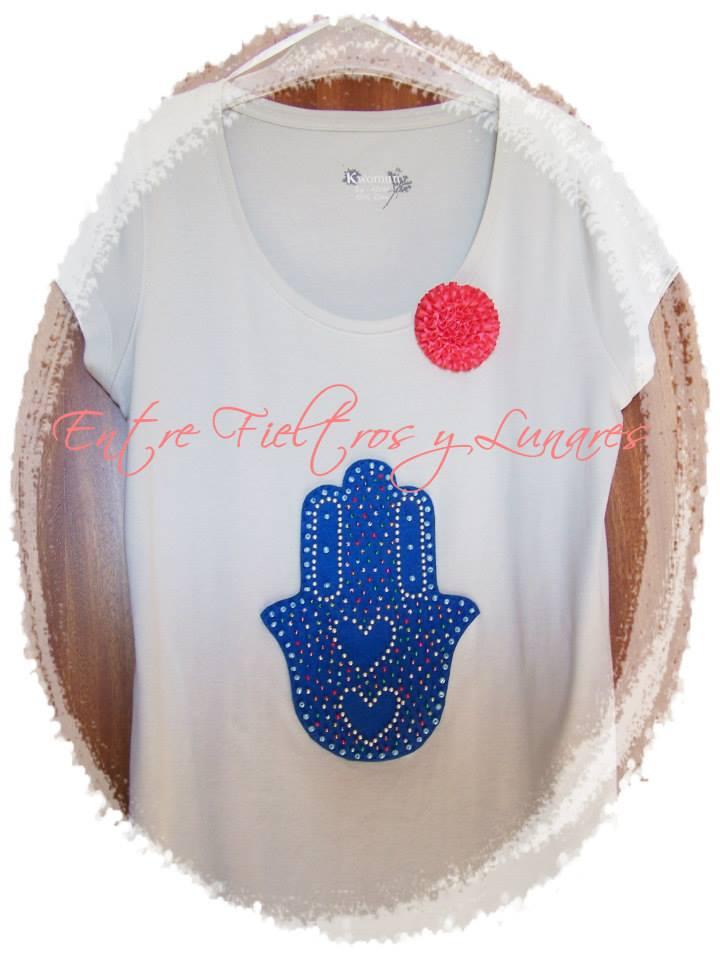 Preciosa camiseta en tono gris perla con la famosa y protectora mano de Fátima, totalmente cosida a mano con engarces de perlitas de colores...